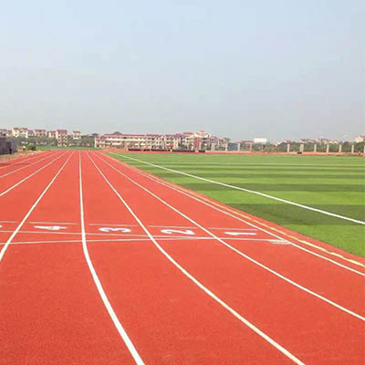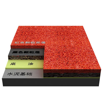 3、用透气型喷面胶与EPDM胶粒、EPDM胶粉按规定比例配比,搅拌均匀,倒入专用喷涂机中,按顺时针和逆时针方向分两遍到三遍进行喷涂,固化后及为防滑耐磨层,普遍使用的颜色为红色和绿色。