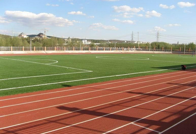 2.卓越的耐磨防滑性能 采用更为耐磨的聚氨酯面层配方,取代EPDM颗粒作为防滑面层,配方添加特种助剂及金刚沙粉进行喷涂,使面层形成一种更为防滑耐磨的凹凸面,既保留了聚氨酯跑道材料耐侯、耐老化等传统特点,又克服了传统聚酯跑道易脱粒的老毛病.